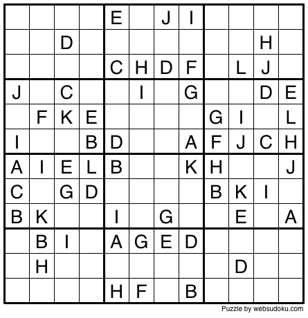 Instructions : Résolvez le Sudoku 12x12 de telle sorte que les lettres de A à L apparaissent une seule fois dans chaque ligne, colonne et région 4x3.